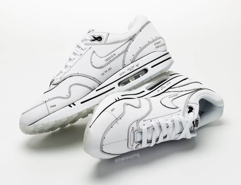 Nike Air Max 1 新品“图纸”配色,全白覆盖鞋身代表图纸底色,黑色车线与中底粗体线条,同分布在鞋面的设计文字相呼应。左、右后跟分别以复古 Nike Air 标志及传奇设计师 Tinker Hatfield 的签名呈现,最后再用乳白色果冻外底收尾,整体不仅个性十足,更颇具二次元气息。