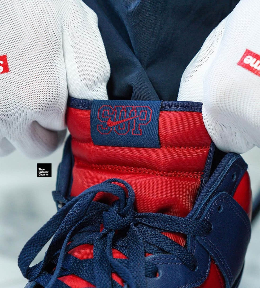 此前曝光的红蓝配色Supreme x Nike SB Dunk High “By Any Means”,近日又有最新上脚图释出。